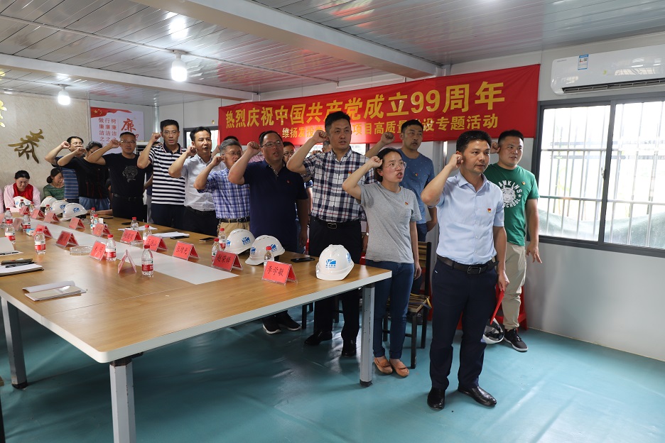 系列活動(dòng)二:黨建引領(lǐng)項(xiàng)目高質(zhì)量建設(shè)專題活動(dòng) 6月30日下午,公司黨支部組織公司全體黨員、預(yù)備黨員、發(fā)展對(duì)象、入黨積極分子前往創(chuàng)業(yè)路(真州路-揚(yáng)冶路)道路工程項(xiàng)目部,開(kāi)展慶祝建黨99周年專題活動(dòng)。 本次活動(dòng)共有五項(xiàng)議程:一是聽(tīng)取項(xiàng)目部匯報(bào);二是維揚(yáng)發(fā)投與華泰路橋有關(guān)負(fù)責(zé)人就創(chuàng)業(yè)路項(xiàng)目建設(shè)的安全生產(chǎn)、揚(yáng)塵管控、質(zhì)量控制、建設(shè)進(jìn)度等方面做了詳細(xì)交流;三是由公司黨支部書(shū)記、董事長(zhǎng)劉迪平同志帶領(lǐng)全體黨員重溫入黨誓詞;四是由劉迪平同志為項(xiàng)目部黨員代表授黨員突擊隊(duì)隊(duì)旗;五是公司黨支部書(shū)記講話。 劉迪平強(qiáng)調(diào):“我們要立足項(xiàng)目高質(zhì)量建設(shè),強(qiáng)化黨建引領(lǐng),帶動(dòng)項(xiàng)目前期工作更加精心,方案設(shè)計(jì)更加精當(dāng),工程造價(jià)更加精準(zhǔn),項(xiàng)目管理更加精細(xì),維護(hù)保養(yǎng)更加精良,讓每一個(gè)維揚(yáng)發(fā)投建設(shè)項(xiàng)目都打上‘精品’的印記?!?/p>
